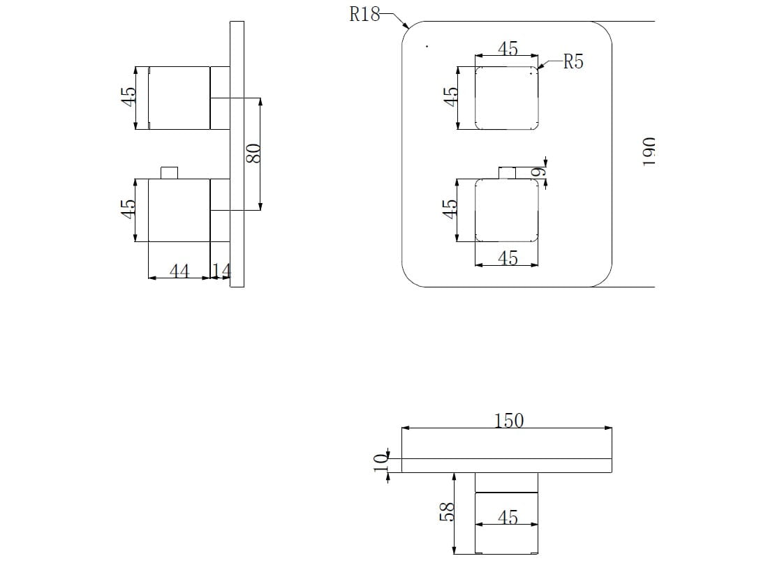 • dwa wejścia (na wodę ciepłą i zimną): 1/2”, dwa wyjścia wody zmieszanej: 1/2”