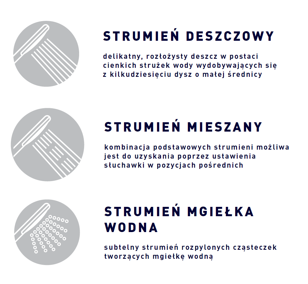 • słuchawka 3-funkcyjna o wymiarach 260x80 mm, strumie deszczowy, mgiełka wodna, mieszany