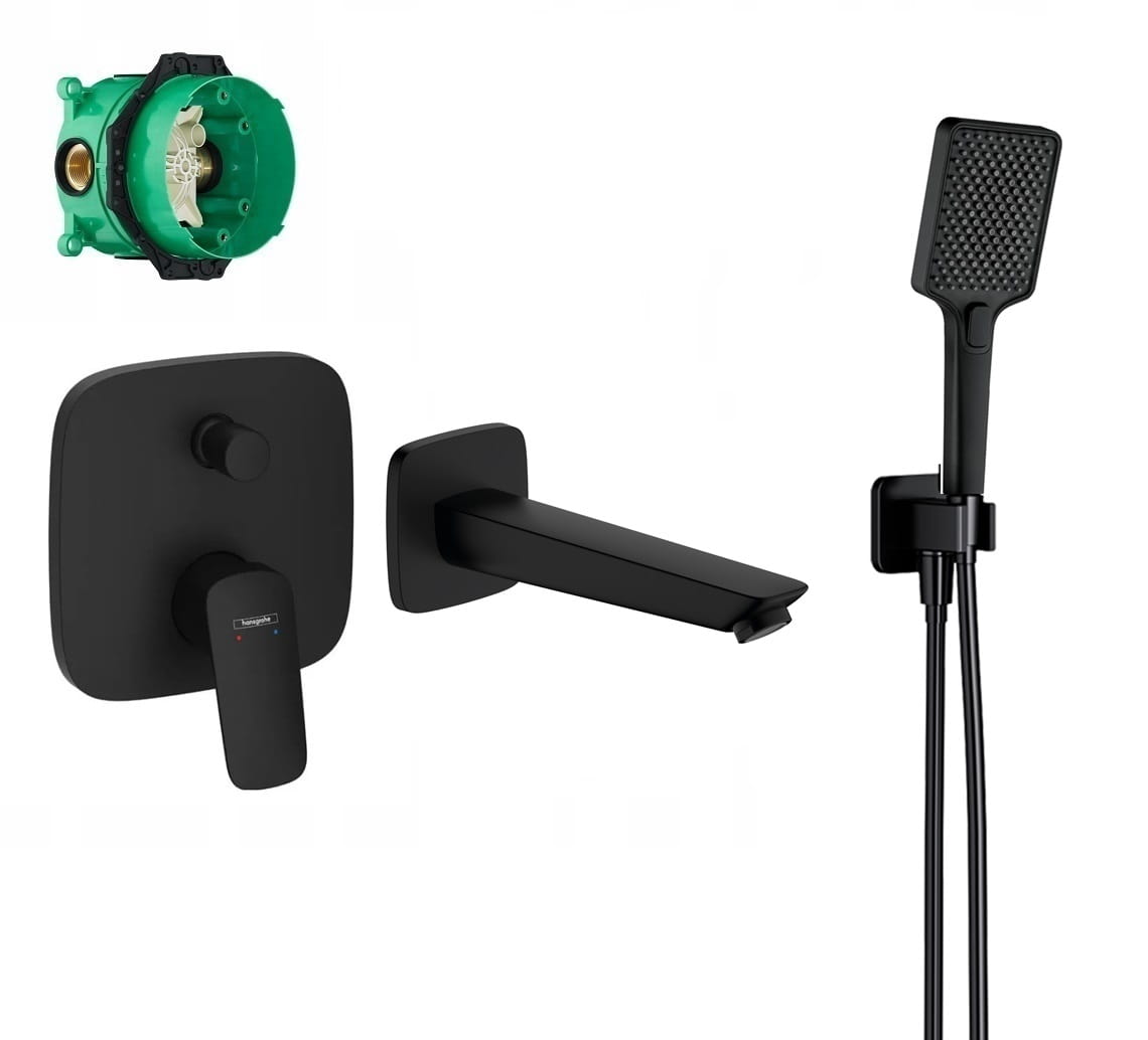 Zestaw wannowy podtynkowy, bateria Hansgrohe Logis 71405670, słuchawka Deante 4 funkcje, wylewka Logis 19,5 cm czarny mat - 12600